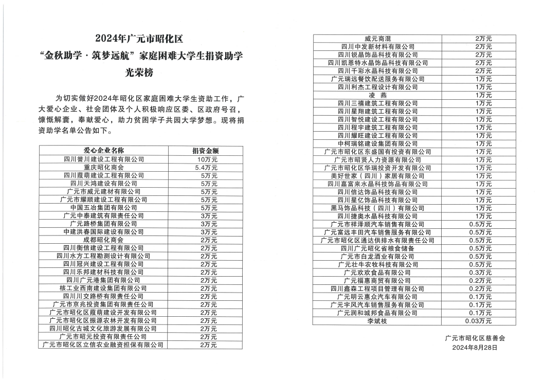 8月28日,昭化區(qū)舉行2024年“金秋助學·筑夢遠航”家庭困難大學生資助儀式,路橋集團作為資助企業(yè)參會并獲得表彰。