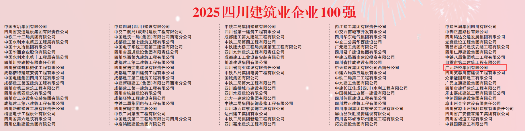 2025年10月23日,四川省企業(yè)聯(lián)合會(huì)、四川省企業(yè)家協(xié)會(huì)首次發(fā)布2025四川建筑業(yè)企業(yè)100強(qiáng)名單,路橋集團(tuán)成功入圍。